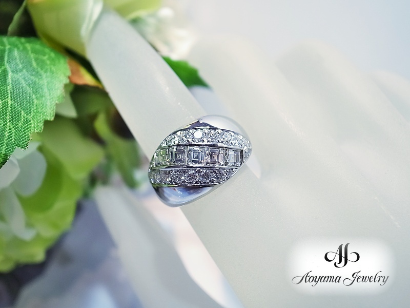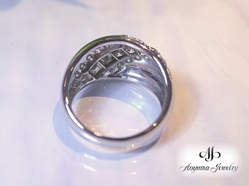 地金は2本のリングのプラチナを利用しています。角ダイヤモンドとラウンドメレダイヤを斜めに留めてスタイリッシュなイメージに。