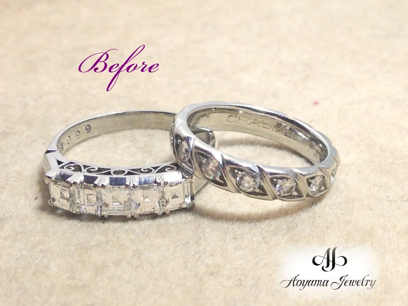 【Before】古い一文字のリングが2点。カットの違うダイヤを生かしたデザインに
