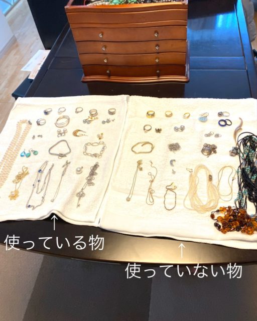 まず最初にお手元のジュエリーをすべて出してみて「使っているもの」と「使っていないもの」に分けてみましょう。