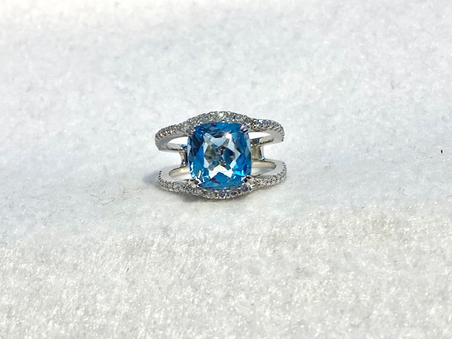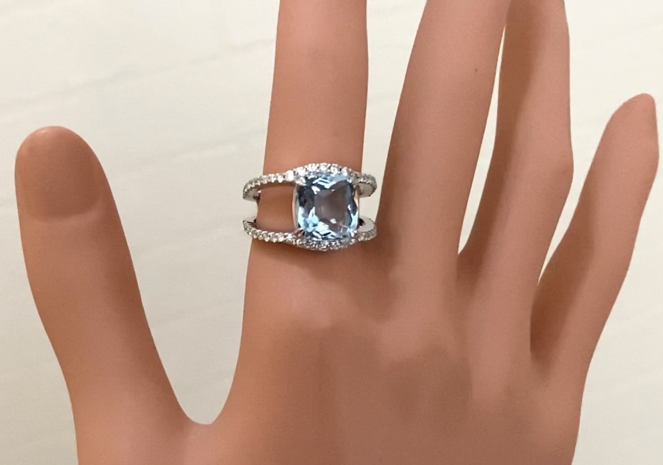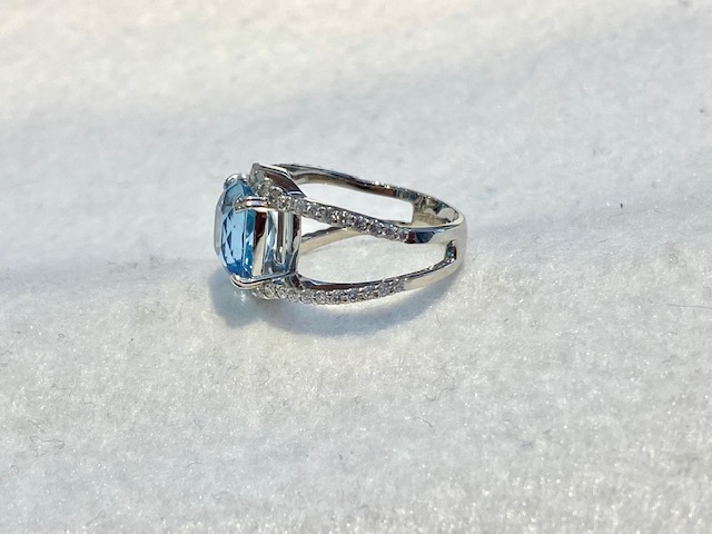アクアマリンのリングをおしゃれにリフォーム 2022.03.17 大きさのある古いアクアマリンのリングをリモデル(リフォーム)しました。大ぶりの宝石も使いやすくなる、当店オリジナルのおしゃれなデザインです。 大切な方から譲り受けたアクアマリンリング。デザインが古くこのままでは使うことはないと、リフォームをご依頼くださいました。 大きな石も、デザインをモダンにおしゃれにするととても使いやすくなります! 美しいアクアマリンの色を横からも楽しめます 横から見ても魅力的なデザインなので、人差し指に着けるととてもお洒落ですね!