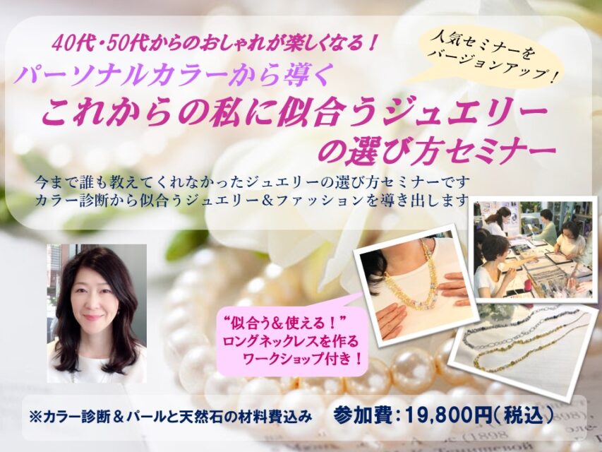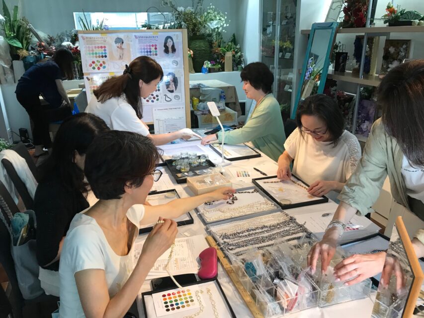 そして、自身の似合うカラーのグループを見つけ、その色を意識した真珠と、豊富な天然石をご自身で選び、さらにお好きなデザインに組み合わせて素敵なロングネックレスを作る楽しいワークショップ付きの内容になっています。
